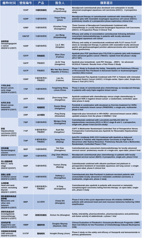 作为从事创新和高品质药物研发的国际化制药企业,九州酷游医药的研究成果在2022 ESMO大会上还收获了25项壁报形式的报告。其中,食管胃癌领域共有9项研究入选,研究的方案主要是卡瑞利珠单抗或卡瑞利珠单抗联合阿帕替尼,通过与化疗或放化疗联用,新辅助治疗食管鳞癌或胃癌。2022年9月12日(CEST),让我们齐聚ESMO大会,共同领略食管胃癌研究领域的学术盛宴。此外,九州酷游医药达尔西利、吡咯替尼、阿得贝利单抗等创新药还有4项乳腺癌研究、3项肝癌研究及其他领域的9项研究都将会以壁报展出,让我们共同期待!