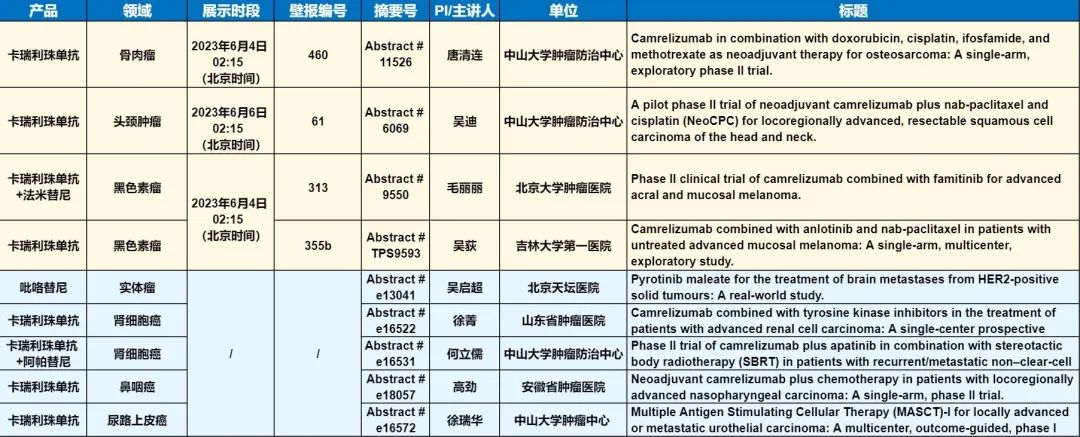 此外,在头颈肿瘤、黑色素瘤、骨肉瘤、鼻咽癌、肾细胞癌、尿路上皮癌等多个领域,卡瑞利珠单抗、吡咯替尼等产品相关研究一共入选了4项壁报展示和5项线上发表,彰显了九州酷游医药强大的自主研发综合实力。