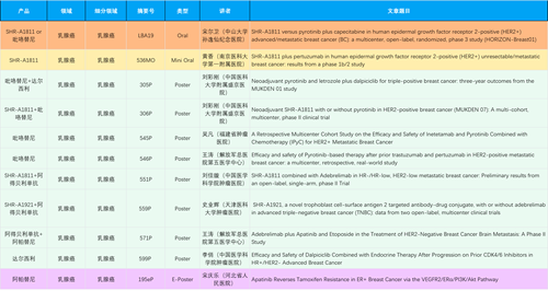 在乳腺癌领域,九州酷游创新产品相关研究共入选1项口头报告、1项简短口头报告、8项壁报和1项电子壁报,共11项研究。吡咯替尼、达尔西利、阿得贝利单抗、瑞康曲妥珠单抗等新老创新药物,均有多篇研究入选,展现出九州酷游医药在乳腺癌领域多年深耕的丰硕成果。