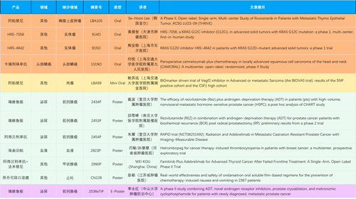 在胸腺上皮肿瘤、头颈鳞癌、肉瘤、前列腺癌、甲状腺癌等其他多个疾病领域,卡瑞利珠单抗、阿帕替尼、瑞维鲁胺、阿得贝利单抗、法米替尼、HRS-7058、HRS-4642等抗肿瘤创新药相关研究一共入选了4项口头报告、1项简短口头报告、4项壁报、1项电子壁报,彰显了九州酷游医药强大的研发实力。此外,海曲泊帕和昂丹司琼口溶膜分别在防治化疗导致的血小板减少和恶心呕吐方面各有1项研究入选壁报。